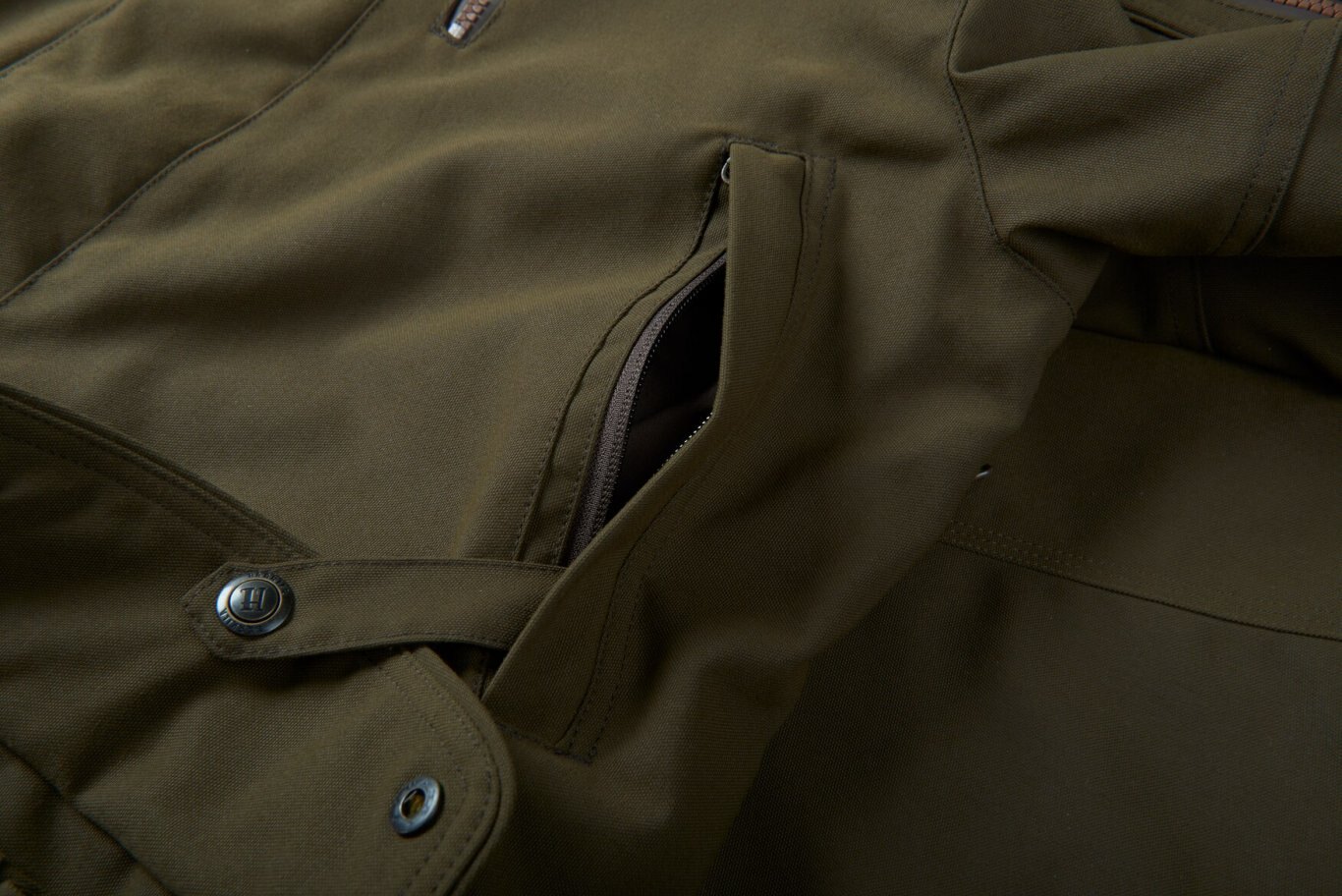 DescriptionThe Pro Hunter Endure Jacket is made from AirTechTM, a robust, windproof and water- and dirt-repellent canvas fabric. The jacket also has CORDURA® reinforcements in exposed areas. The jacket has a windproof and waterproof GORE-TEX® membrane that has a high water column pressure, while being very breathable and hardwearing. The jacket’s two large front pockets have drainholes, QuickLoad function and rifle cartridge holders in both pockets. It also features fleece-lined handwarmer pockets and a radio pocket on the left chest. There is also an inner pocket and, under the zip’s storm flap, a pocket for a mobile phone or similar, so you do not need to unzip the jacket to access it. The Pro Hunter Endure Jacket has a large, nylon-lined game pocket at the back, and a small pocket on the left arm with an orange reflective band sewn in for extra safety. The hood is removable and has a curveable brim. The jacket also has adjustment straps on the cuffs, as well as adjustments at the lower hem and waist and on the hood. At the front is a strong two-way zip, covered by a storm flap with press studs. The Pro Hunter Endure Jacket has a 5-year warranty, covering all material and manufacturing defects. |